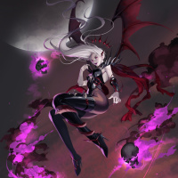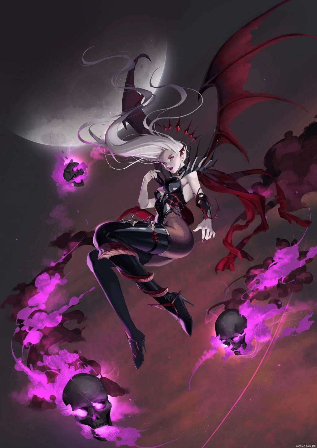 a fantasy character with white hair, wearing a red and black outfit that resembles the typical attire of a succubus. The character is set against