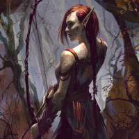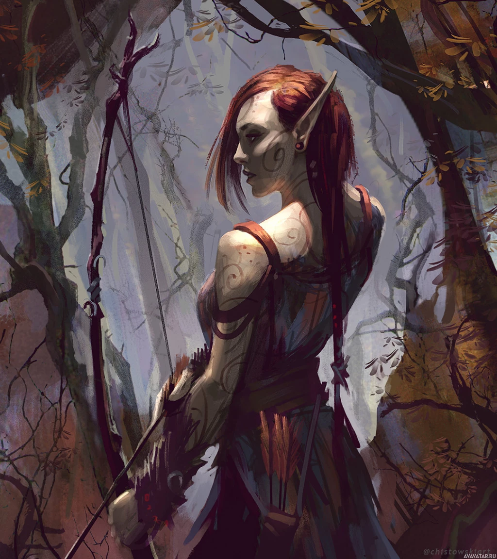 a fantasy setting. This character appears to be an elf, as indicated by the ears and pointed features that are common for depictions of elves in