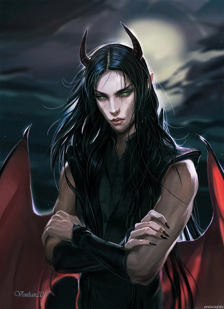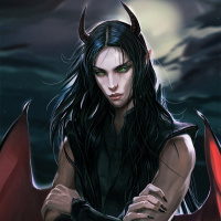 dark hair, pointed ears, and what seems to be horns on their head, which are typical attributes of succubi in fantasy media. The setting appears to be
