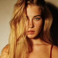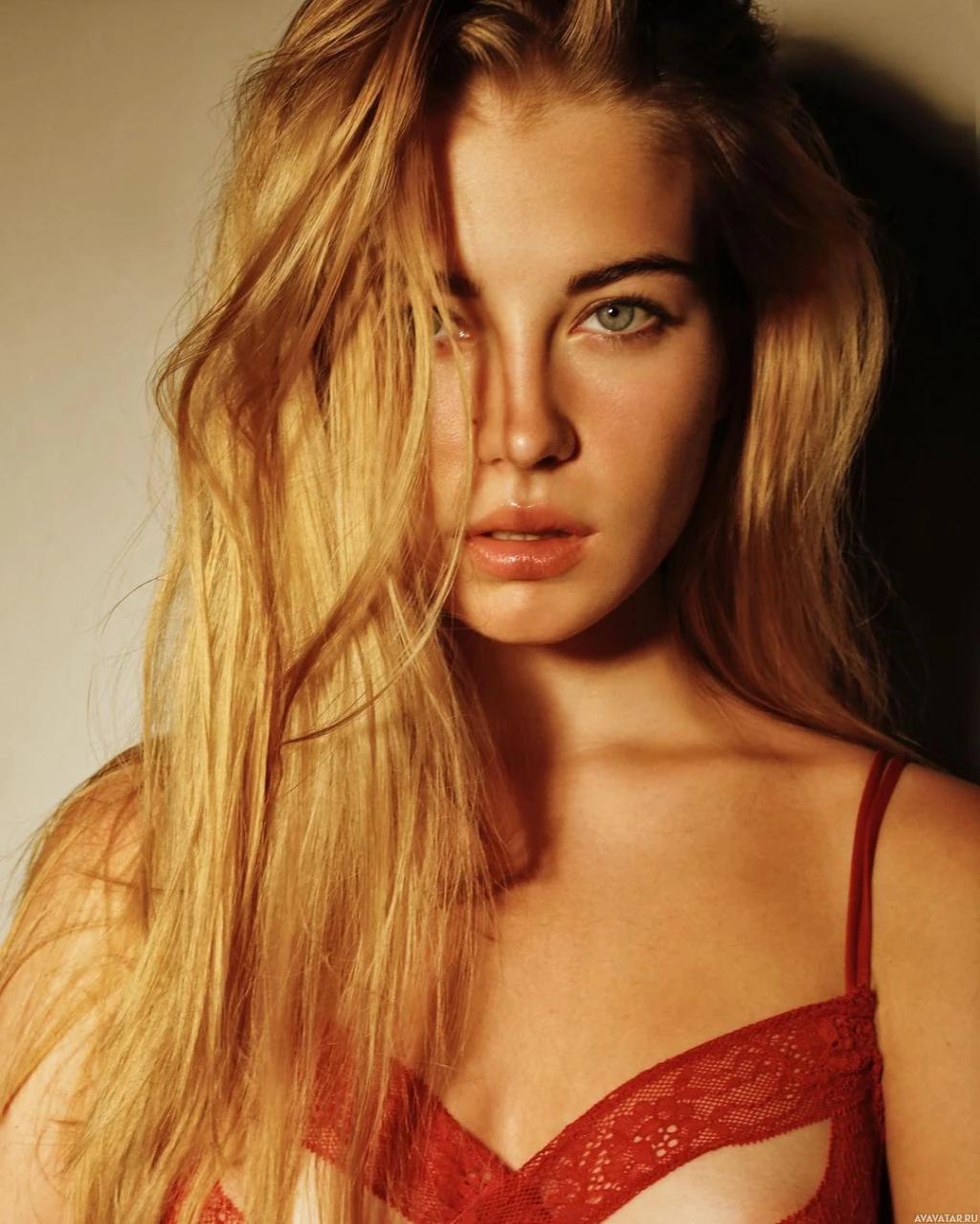 blonde hair. She appears to be wearing lingerie, specifically a red bra and matching underwear, and her hair is styled in