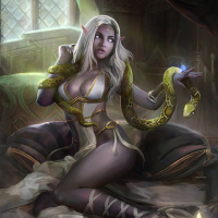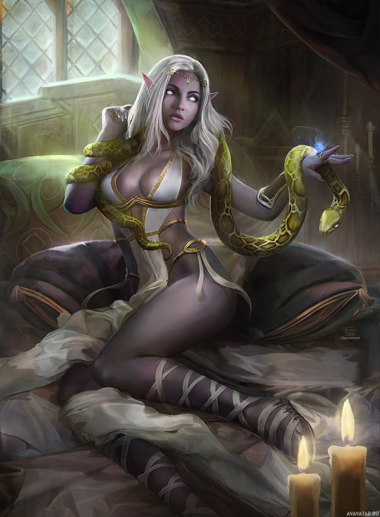 fantasy settings and is seated on a cushioned surface. In her hand, she holds a snake, which adds to the mystical or magical theme of the character. The setting looks like a cozy interior with