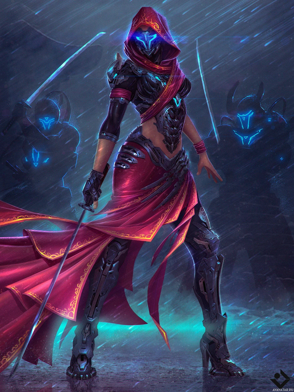 a battle scene or a quest in progress. The background is dimly lit with blue and green hues that give it a cyberpunk or futuristic feel. The overall impression is one of a powerful warrior ready to face any challenge, embodying a blend of technology and tradition.