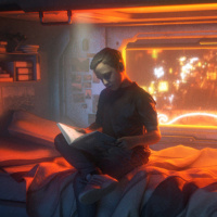 space station. They are engrossed in reading a book, which is held in their hands. The environment has an industrial and utilitarian design, with pipes and wires visible around them, enhancing the sense of being in a confined, possibly artificial