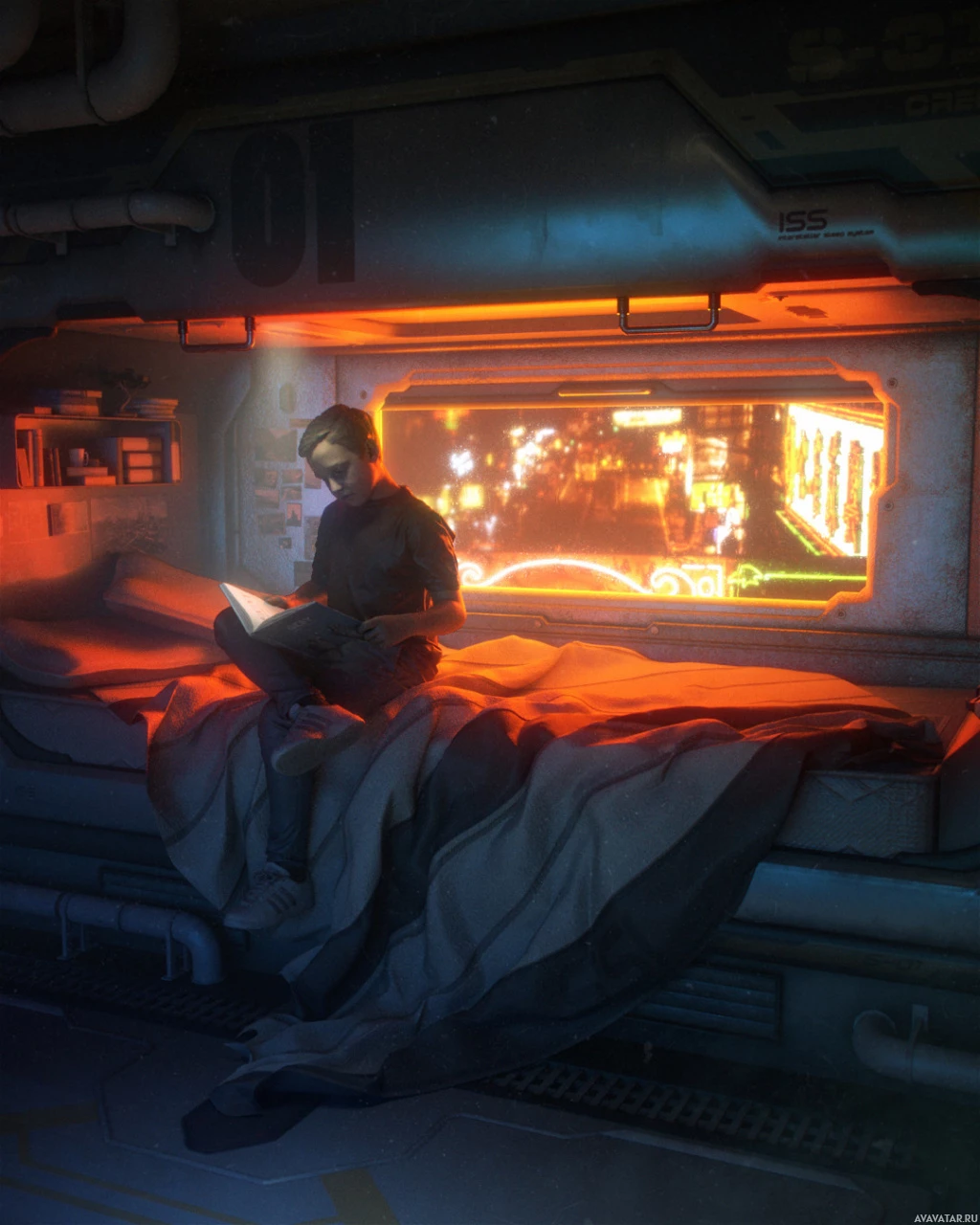 The image depicts a scene set in what appears to be a futuristic or science fiction context. A person is lying on a bed within what looks like the interior of a spaceship or