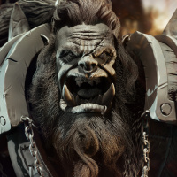 a menacing expression, wearing armor and wielding what appears to be a weapon. The character has exaggerated features typical of fantasy creatures like large ears, a thick brow,