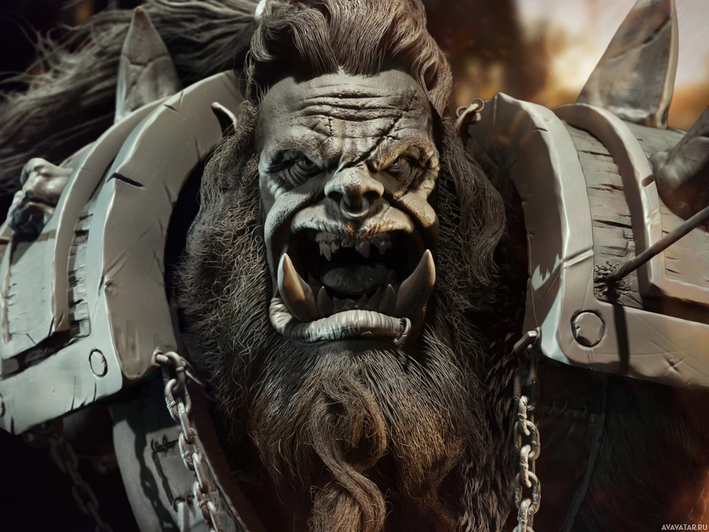 a fantasy character resembling an orc, which is a mythical creature often found in various types of media such as literature, video games, and movies. This particular orc is shown with