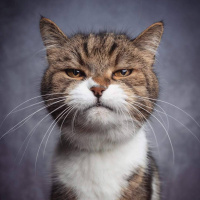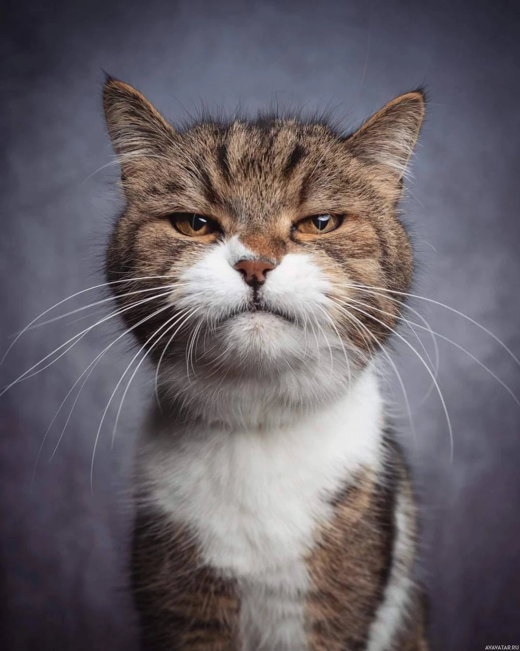 arched eyebrows and a downturned mouth, which can sometimes be associated with a "grumpy" look in cats. This cat is indoors, standing on what appears to be a floor with