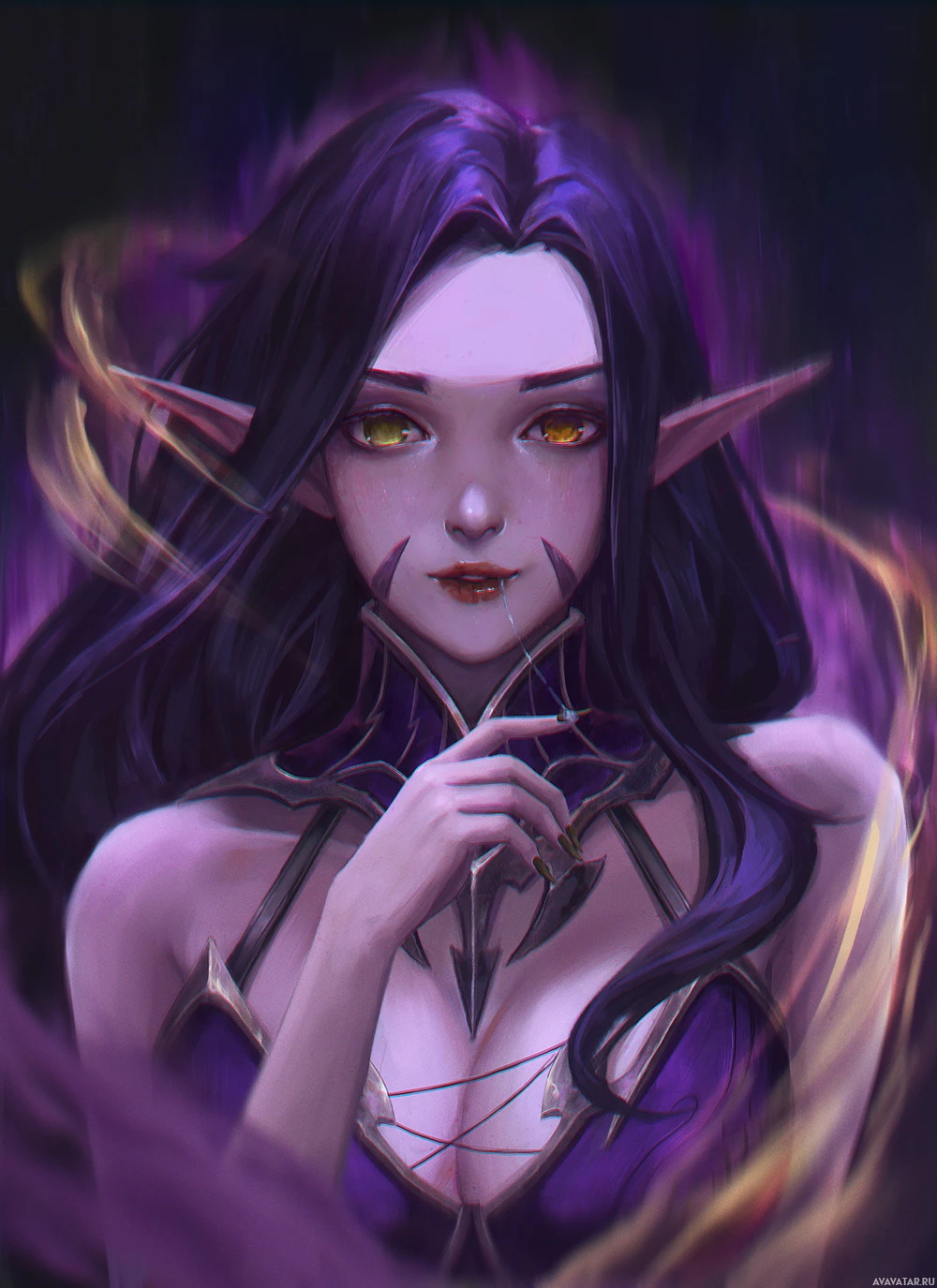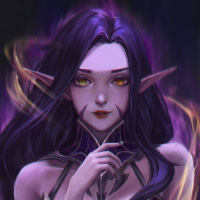 purple hair and is wearing what seems to be magical or mystical clothing, suggesting she might have powers or special abilities within her universe. The character's expression is contemplative or thoughtful, and the overall art style suggests that this could be from