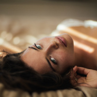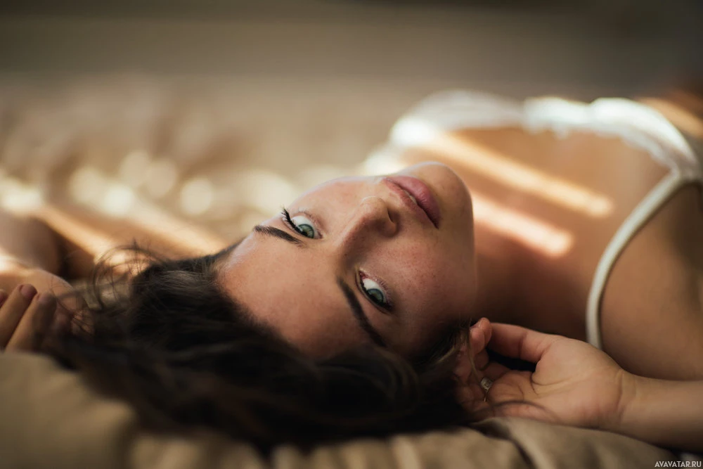 The image features a woman lying on her side with one hand gently touching her face, which appears to be resting on the bed. She is looking directly at the camera with