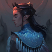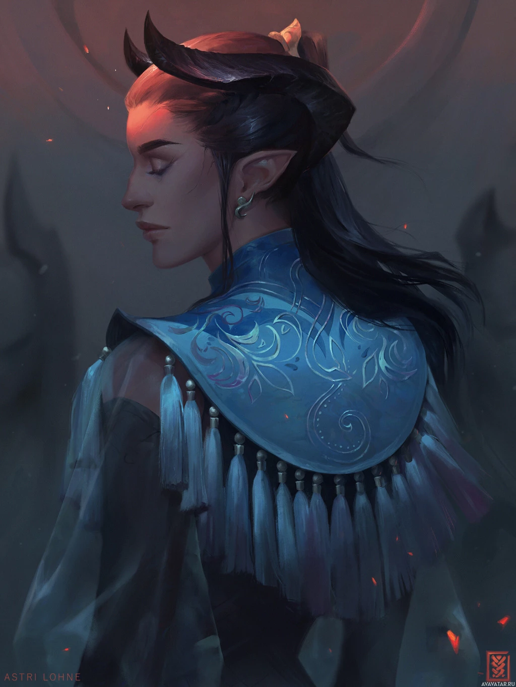 various mythologies and folklore. They also have a tail that curls up at the end, resembling that of a fox or similar creature, which could suggest they are a shape-shifter or possessing traits of an animal. The character's eyes are closed, giving them a serene or meditative appearance. They are wearing what appears to be armor or some kind of protective garment adorned with feathers, possibly indicating a status or role within their