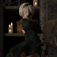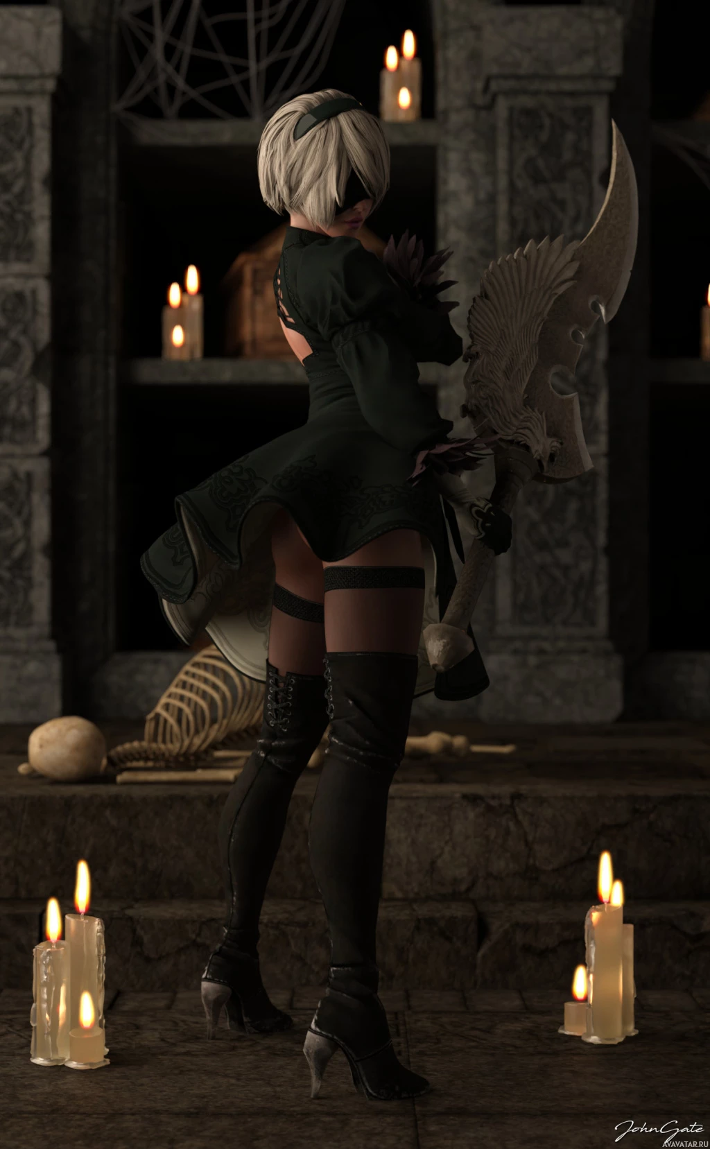 the video game "Nier: Automata." It is taken from behind and shows the character wearing what appears to be a gothic or fantasy-inspired outfit, with elements such as a corset, stockings, and boots. The setting includes a dungeon-like environment with stone flooring, candles providing lighting, and a cryptic,