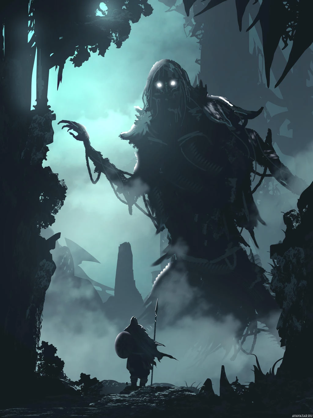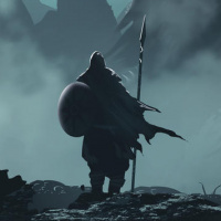 a silhouetted figure that appears to be a warrior. This figure is holding a lance and is wearing armor, suggesting they are prepared for battle or confrontation. In the background, there is another figure that seems less distinct due to
