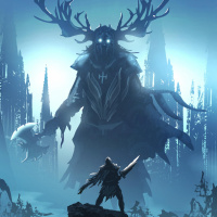 На картинке изображена фантастическая сцена, в которой воин с мечом в руках стоит на скалистой местности. На заднем плане виден внушительный силуэт монстра с оленьими рогами, который может быть интерпретирован как мифическое существо или демон. Эта сцена сочетает в себе элементы приключений и сверхъестественных сражений, которые обычно встречаются в жанрах фэнтези.