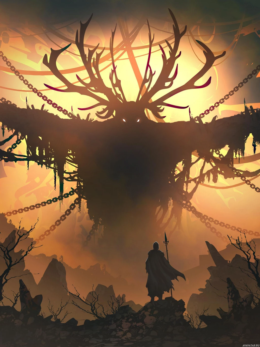 monstrous silhouette looms over the landscape. This creature has antlers like those of a stag and appears to be some sort of