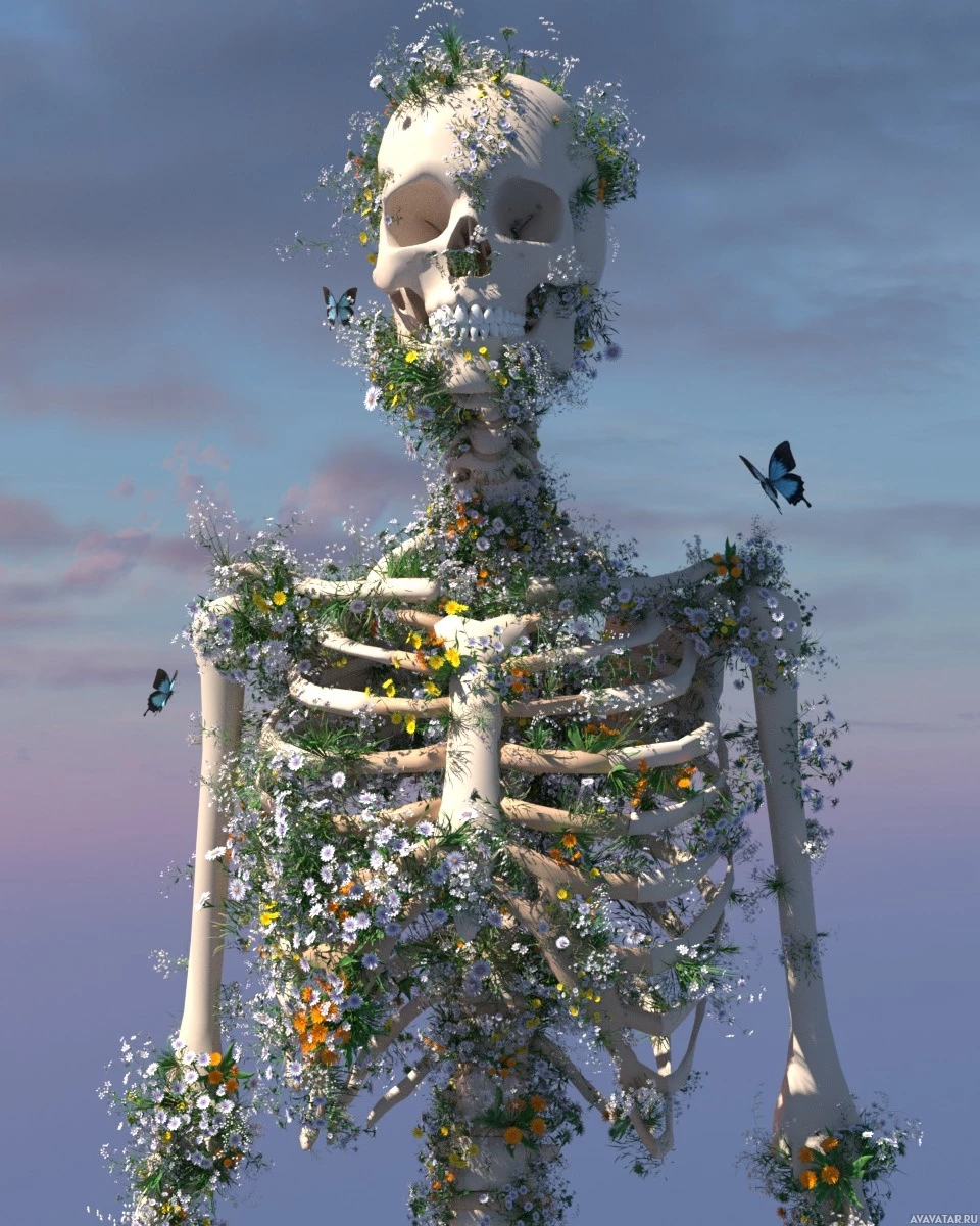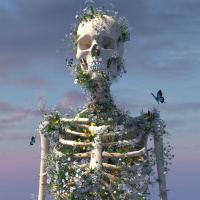 This image features a skeleton that has been artistically modified to have plants and flowers growing on or around it, giving