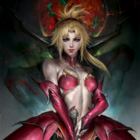blonde hair and is wearing red and black armor with wings on her back, suggesting she might be portrayed as an angel or some mythical creature. Her expression is serious, and she's holding a staff that resembles a key, which could imply that she holds power or keys to something significant in the context of the story or game this character belongs to. The background has a mystical feel with swirling clouds and an ominous