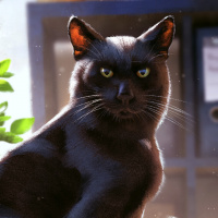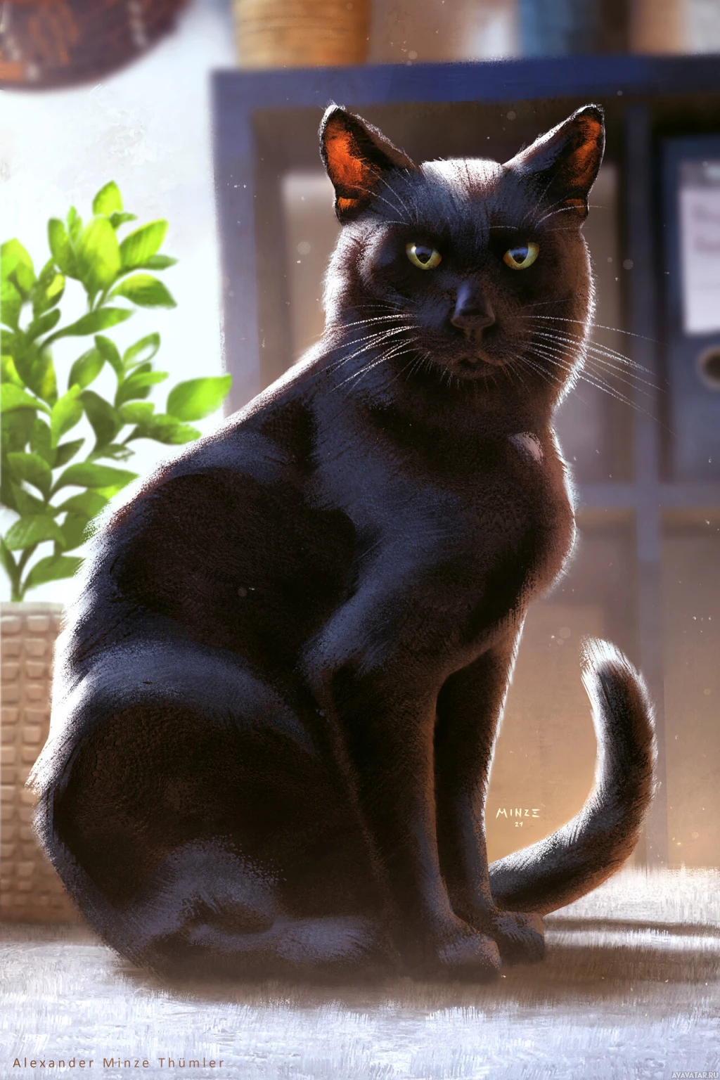 a plant in the background that looks like it could be a potted herb. There are no people visible in the picture, so it's solely focused on the cat as the main subject. The style of the image is detailed with