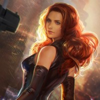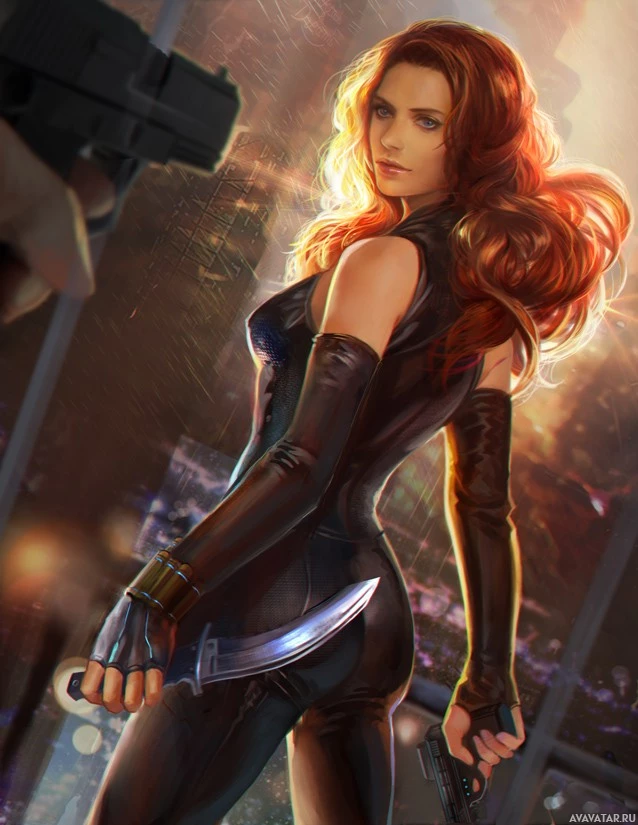 Black Widow from the Marvel comics and movies. She is depicted in her