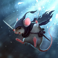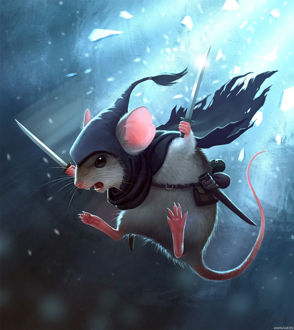 a mouse character. This mouse has human-like features, such as the ability to stand upright and hold objects like a sword in its paws. It is dressed in armor with a cloak, suggesting an adventurous or heroic theme. The setting appears to be dark and stormy, with snowflakes falling and a dramatic sky, which adds to