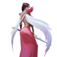 a female character who appears to be from a fantasy setting. She has wings like an angel or fairy, suggesting she might have some sort of divine or magical nature. She is wearing