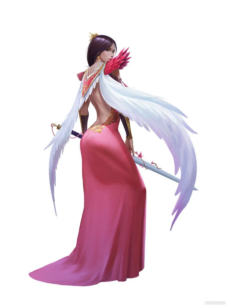 a pink dress that flows elegantly around her, and she also has a sword at her side, indicating she might be a warrior or defender. The character has