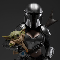 a small creature that resembles a young version of Yoda, a famous Jedi from the same franchise. The figure is well-crafted, capturing the distinctive style and details of the Mandalorian's armor and costume.