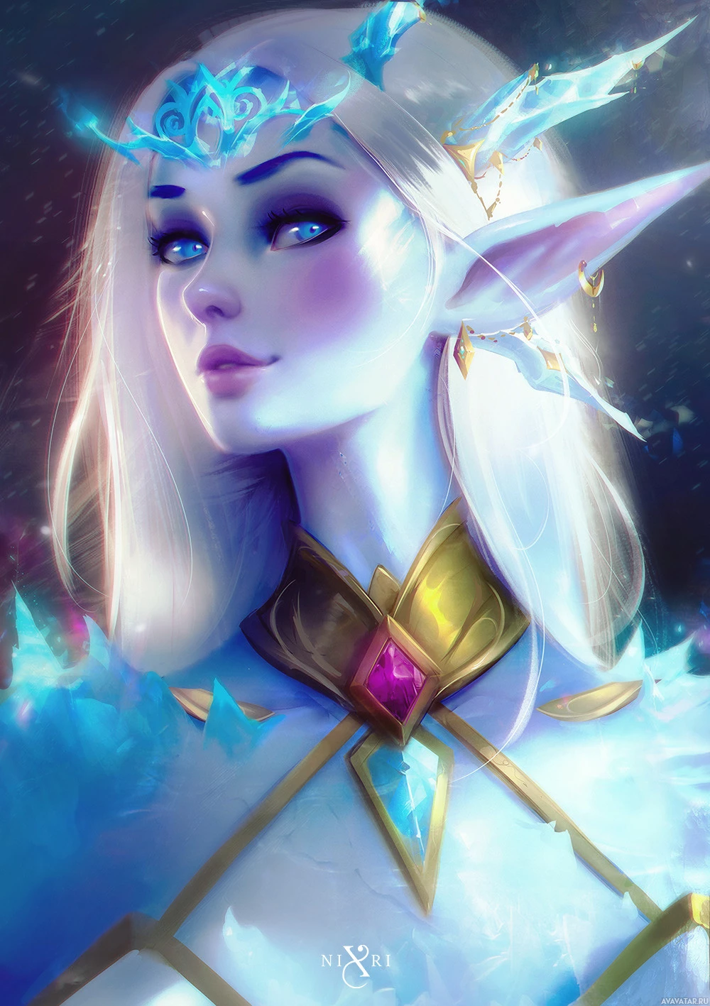 white hair and pointed ears, which are typical attributes of an elf in fantasy artwork. Her