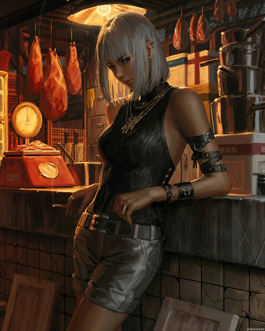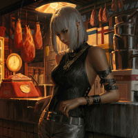 a counter with various items on it, including what looks like bottles and possibly some kind of meat product displayed prominently. The lighting gives the scene a moody and atmospheric feel, which could be indicative of
