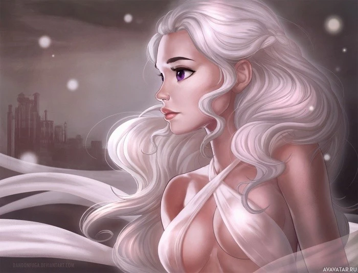 blonde hair and pale skin. She has elongated ear-like structures on her head, which suggests she might be depicted as an elf or some other
