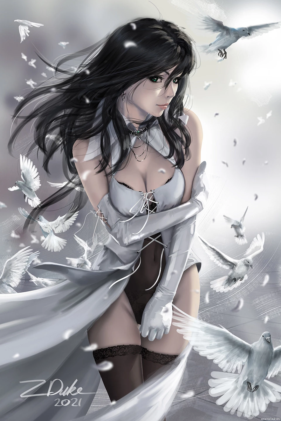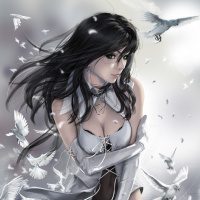 a blend of fantasy and modern elements, possibly suggesting she is from a magical or supernatural world. Around her are white birds, which could symbolize purity or