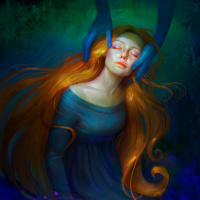 red hair and closed eyes. She has a hand placed gently on her forehead, which suggests she might be experiencing a dream or is in