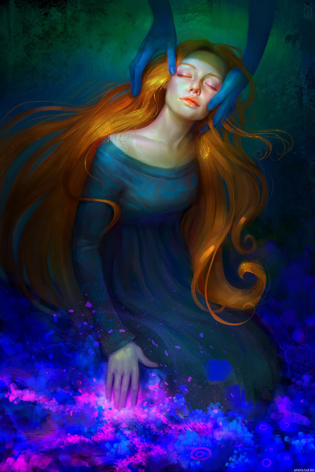 long hair cascades downward, contributing to the serene atmosphere of the image. The background is a darker color, providing a contrast that makes the girl stand out prominently.