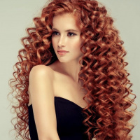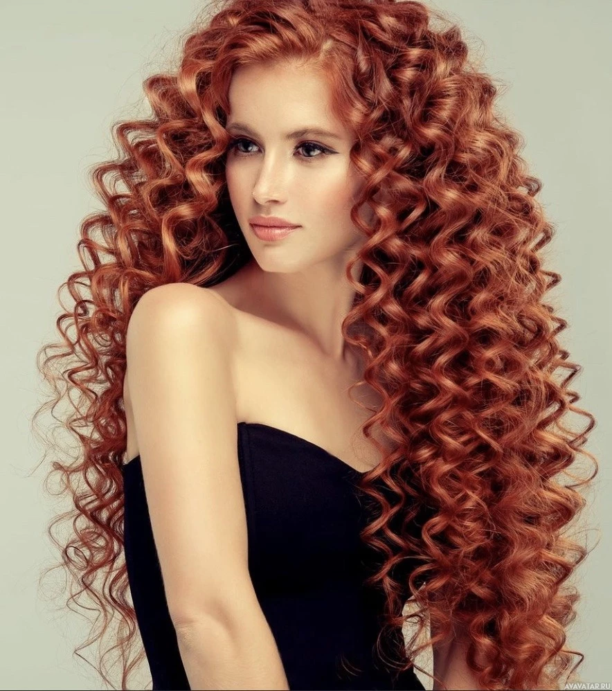 На картинке изображена женщина с длинными вьющимися рыжими волосами. Она одета в черное платье и позирует для фотографии, слегка повернув плечо к камере. Выражение ее лица нейтральное, и она смотрит прямо на зрителя.