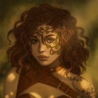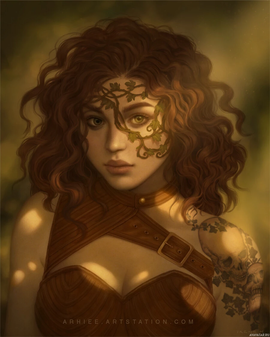 greenery in the background, suggesting she might be outdoors near trees. The style of the artwork is detailed and realistic with a fantasy-inspired theme.