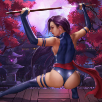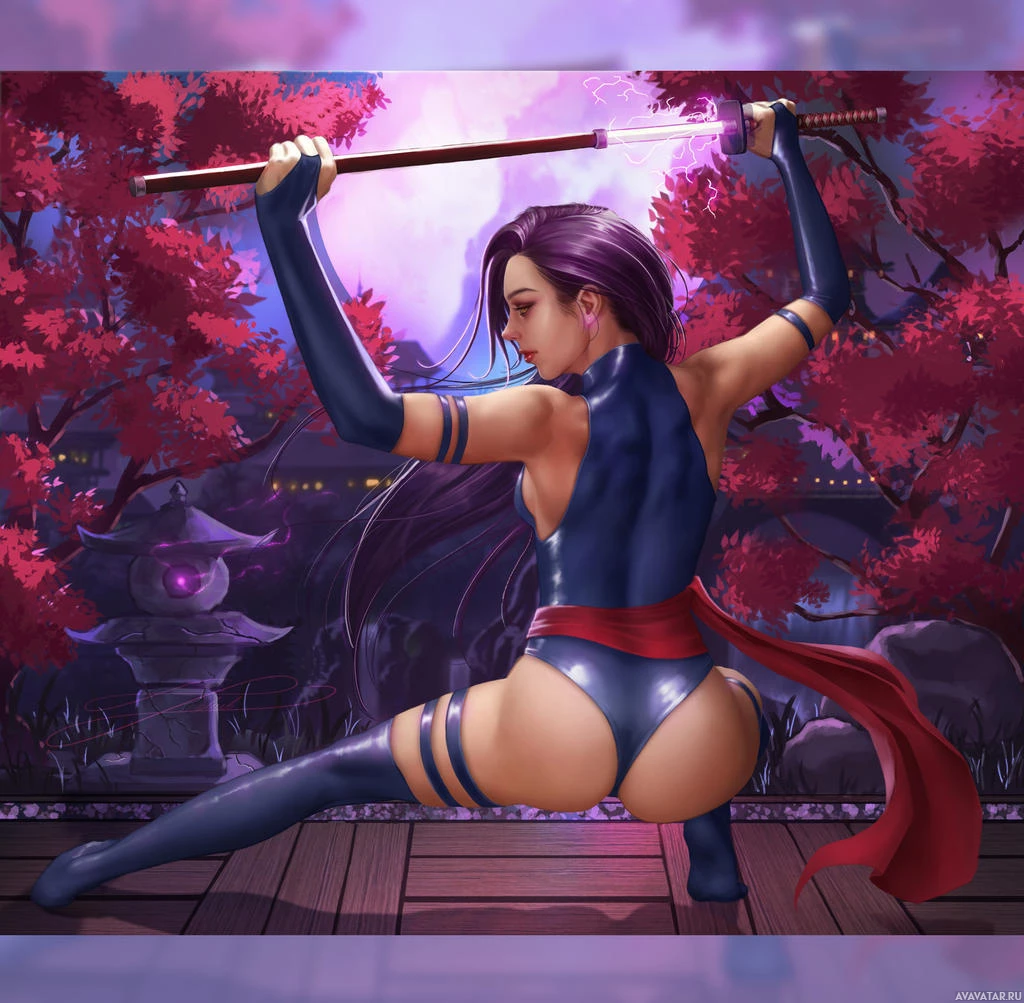dynamic pose, holding a sword behind her back with one hand. Her