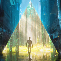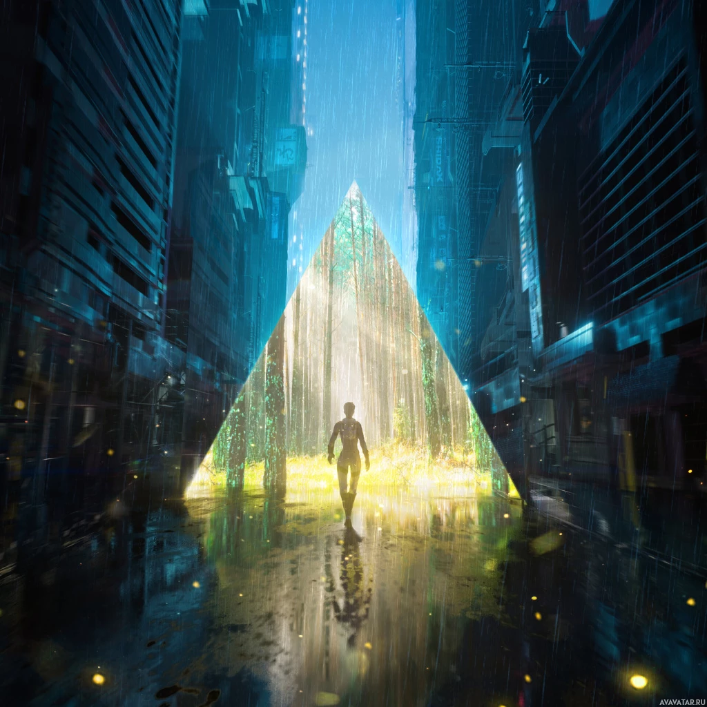 a white outfit and is looking towards a large, glowing pyramid structure that emits a warm light at its base. The background suggests a cityscape with