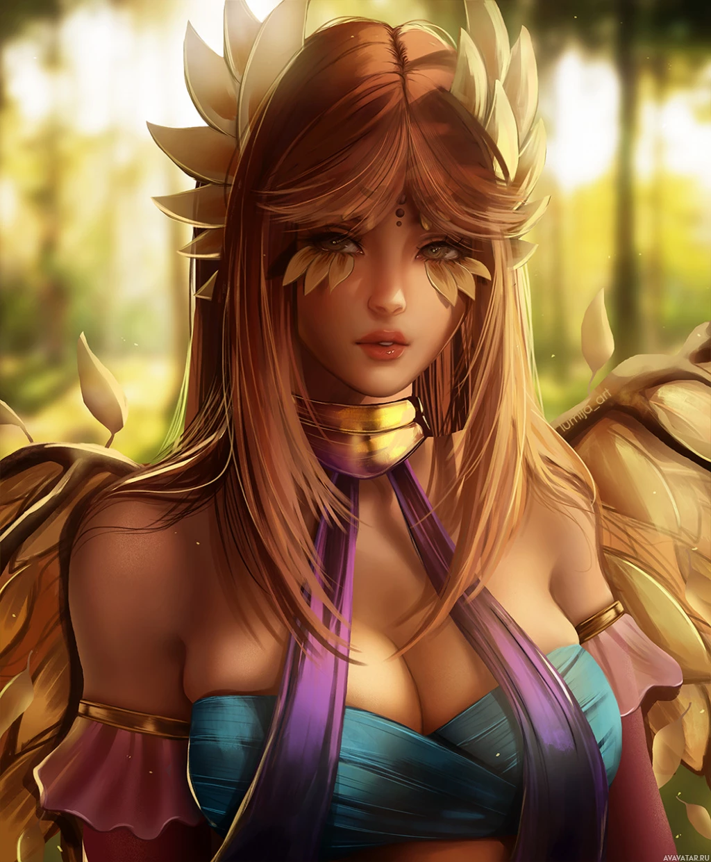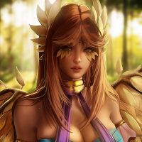 large wings on her back and is adorned with a headpiece that resembles feathers or leaves. The character appears to be part of a digital artwork, possibly from