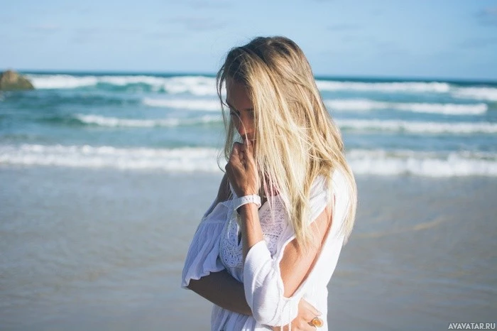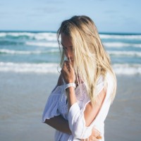 blonde hair and is wearing what appears to be a light-colored, possibly white or off-white top. Her gaze is directed towards the ocean, and she seems to be in