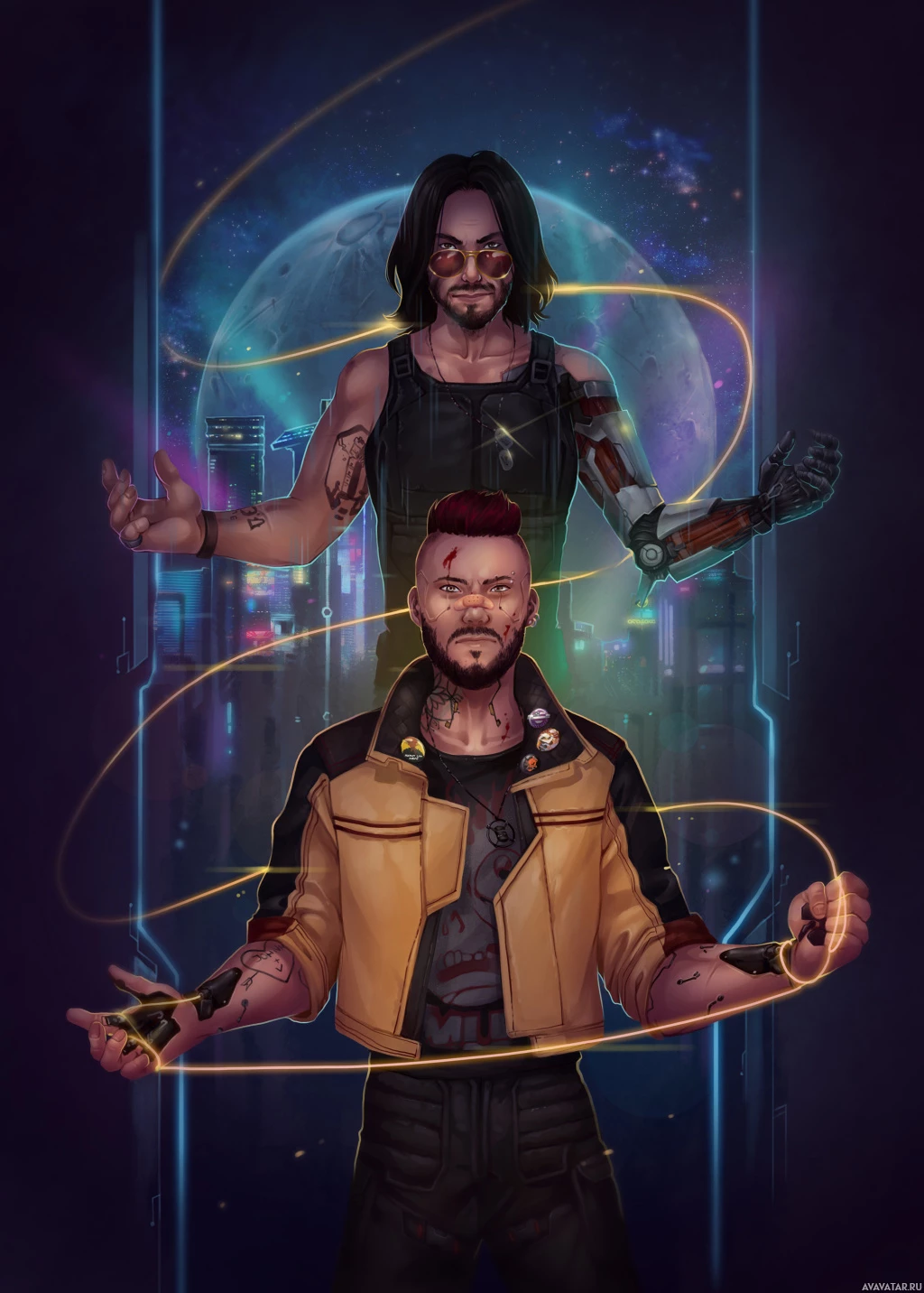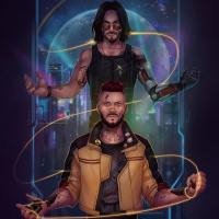 The image depicts three stylized characters, each with distinct features that could be associated with the game "Cyberpunk 2077." On the left, there is a character with spiked hair and a bandage on their face, wearing