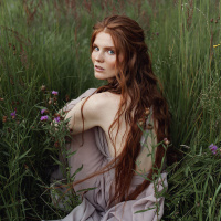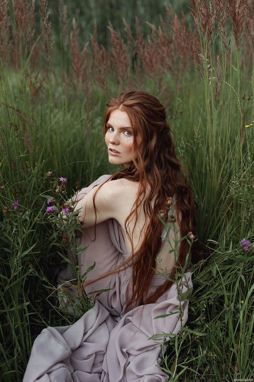red hair, sitting in the middle of what appears to be a grassy field or meadow. She is dressed in a light-colored garment that could be interpreted as a gown or a dress, and her back is turned to the viewer, suggesting she might be looking into something or someone off-frame. The setting suggests a natural, possibly