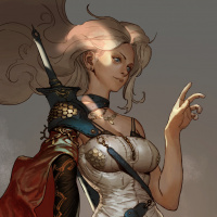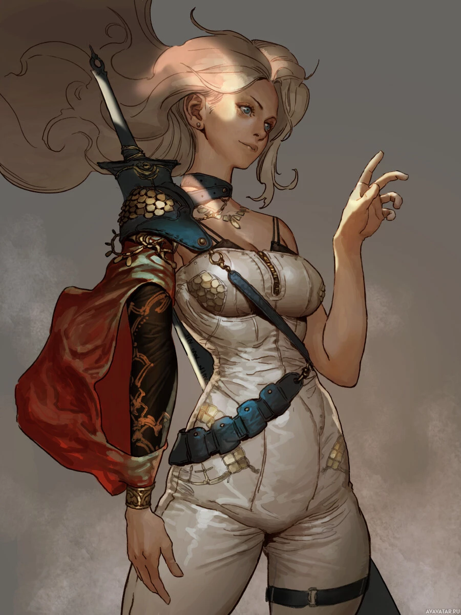 a red cloak or scarf draped over one shoulder, adding a splash of color to her ensemble. The character seems confident, as indicated by the pose and expression. She is pointing towards something out of frame, suggesting