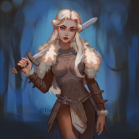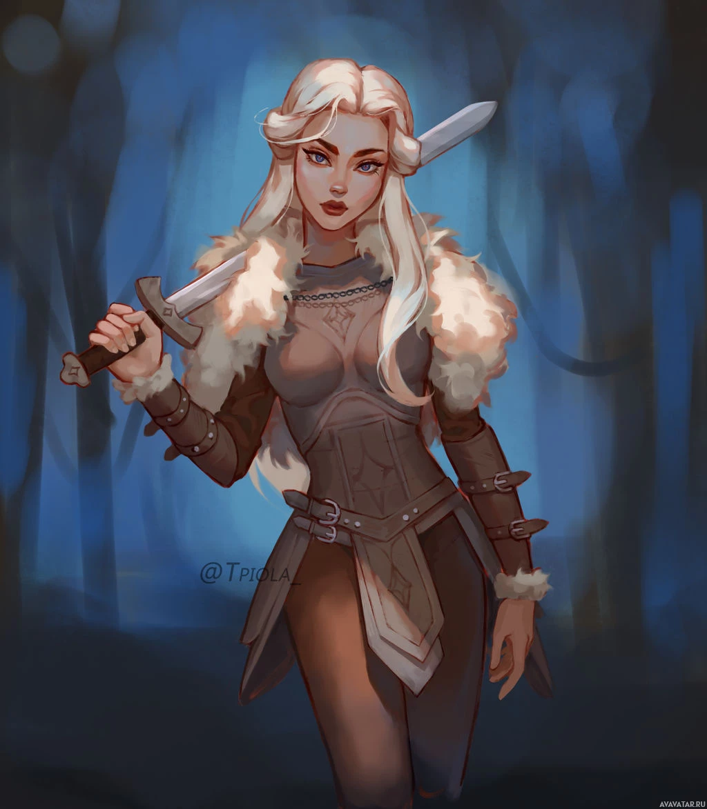 white hair and is wearing armor that includes a breastplate with fur trim, leggings, and boots. In her right hand, she holds a sword. The background suggests a forest or
