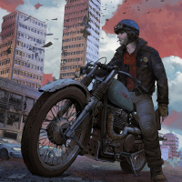 man on the motorcycle is dressed in rugged attire, including leather jackets, jeans, and boots, with visible weaponry like what appears to be a gun holstered at his side. This image could be associated with a genre of artwork commonly found in