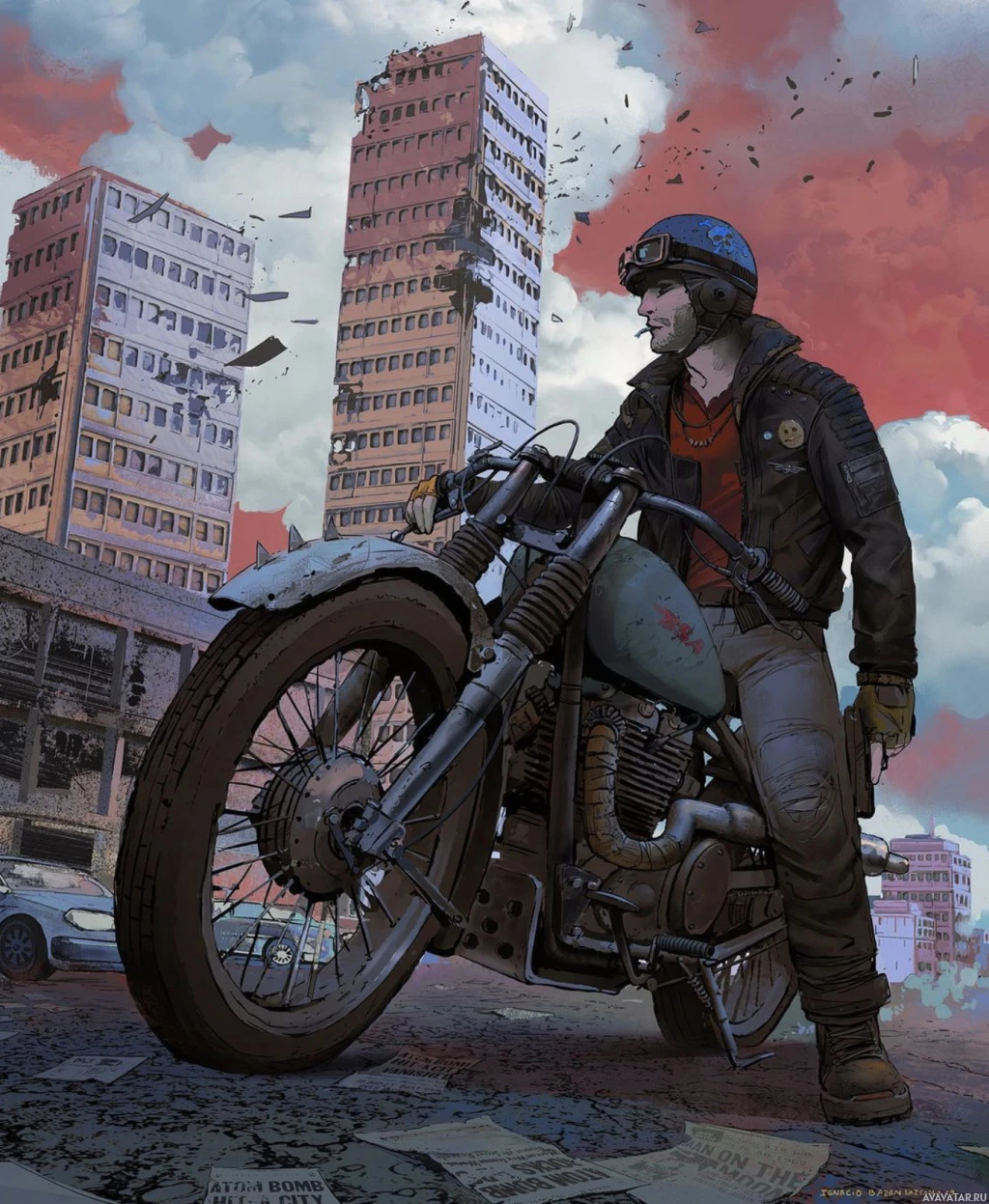 The image depicts a character riding a motorcycle amidst