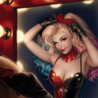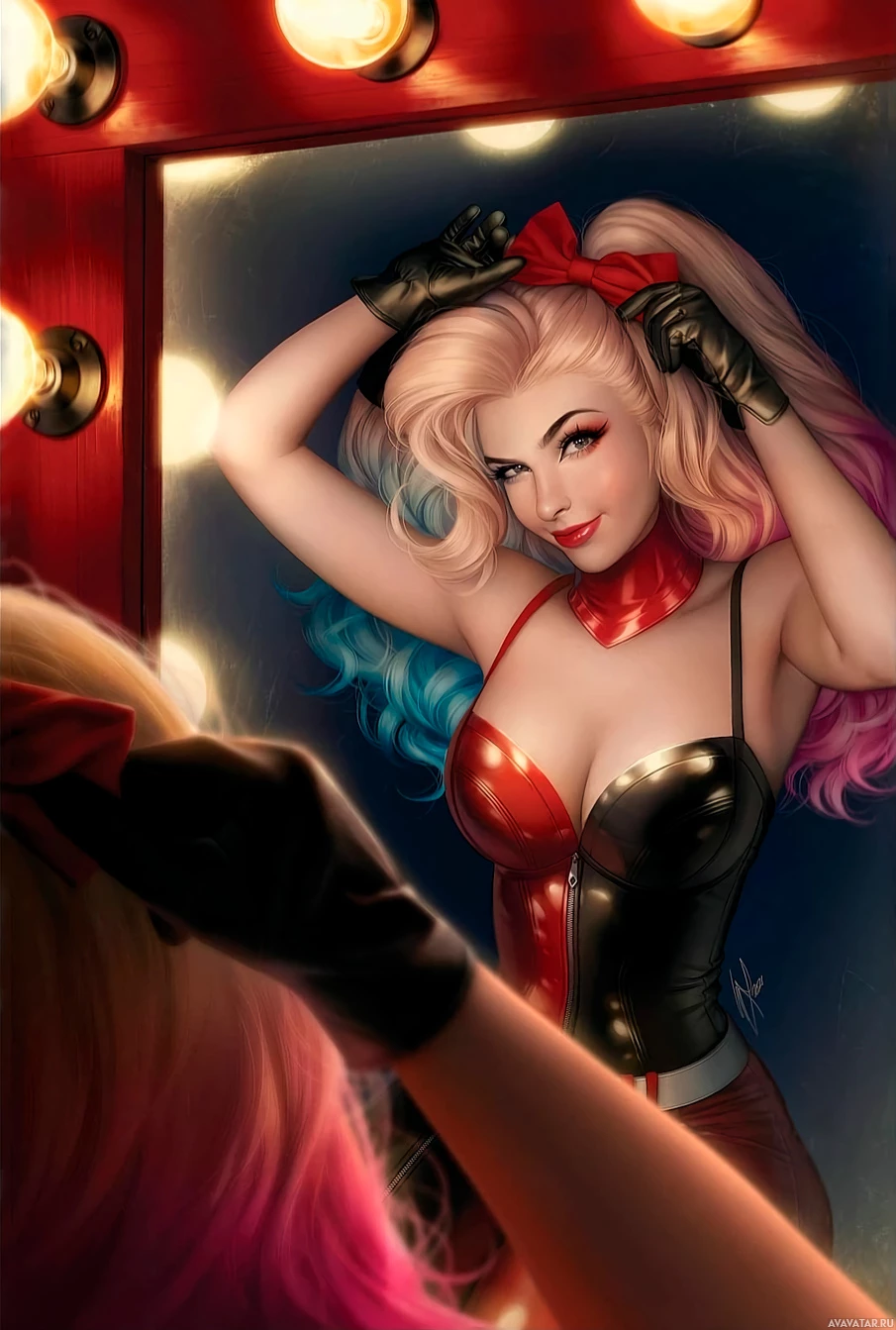 a female character who appears to be Harley Quinn, standing in front of a mirror. She is wearing her signature black and red outfit with the iconic red and blue hair. There's also another character, likely Batman, reflected in the mirror behind her. This character is dressed in a typical