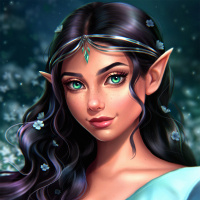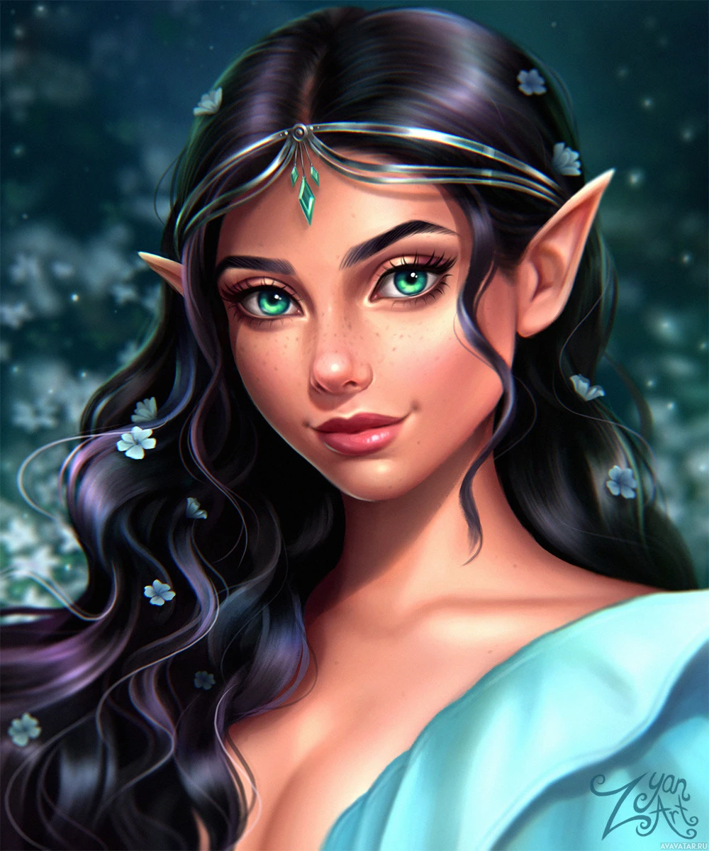 a common trait for elves in fantasy artwork. Her hair is long and dark, with highlights that suggest she may be a light-skinned individual with