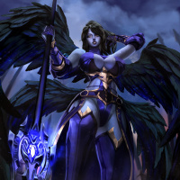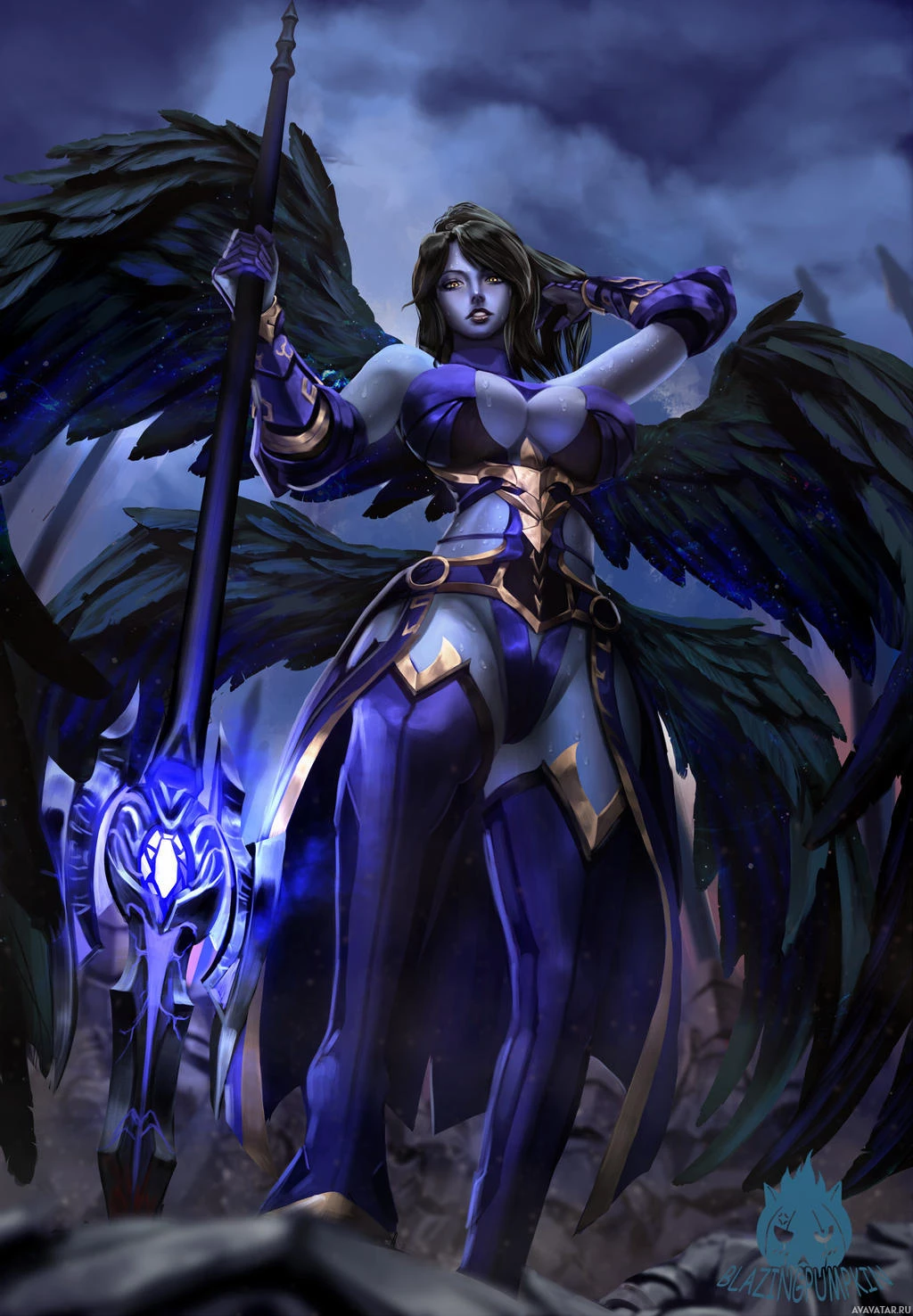 a female figure with wings and a staff, wearing a costume that suggests she might be some sort of warrior or guardian. She has a determined expression on her face and is standing in front of what appears to be