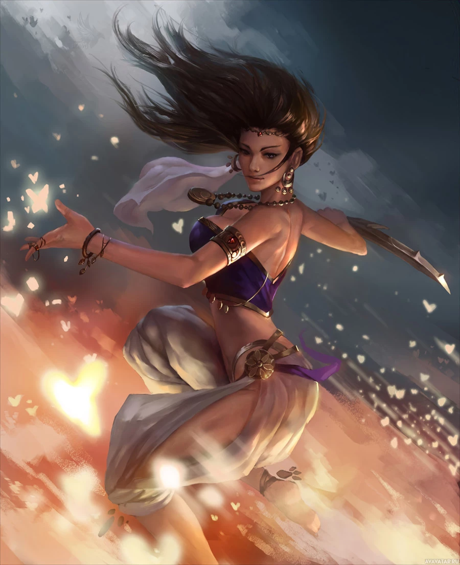 a dynamic pose, suggesting movement and energy. Her attire includes what looks like traditional Indian garments, possibly inspired by