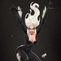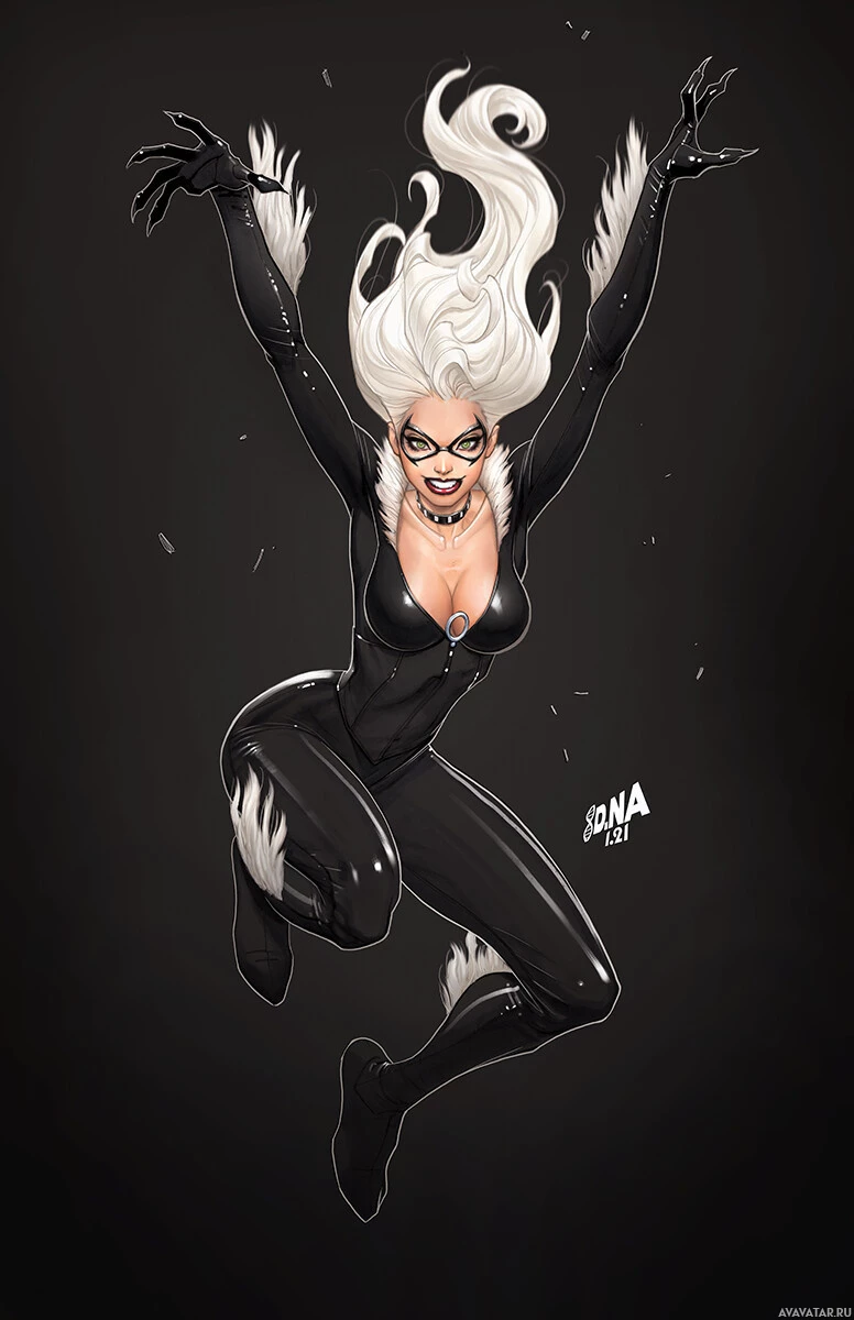 the Black Cat, a superheroine from comic books. She is depicted with long white hair and is wearing a black bodysuit with white details that resemble cat ears, which are iconic to her