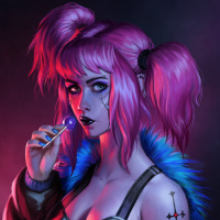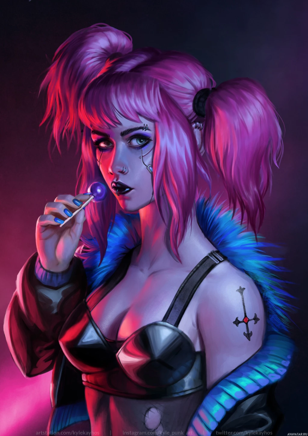 pink hair styled in twin tails and is wearing a black bustier with a faux leather jacket. On her right shoulder, there's a visible tattoo resembling a bird. She is holding a lollipop near her mouth, giving the impression that she's taking a bite from it. The background has a gradient of purple to pink, providing